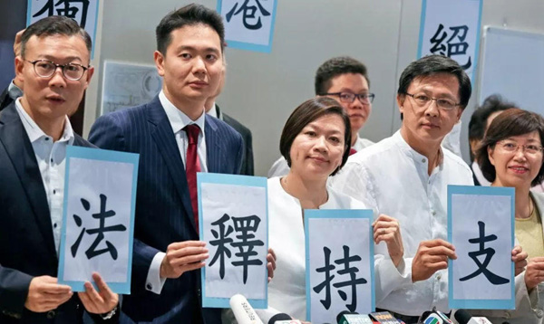 2016年,梁美芬(前排左三)等香港建制派议员支持全国人大常委会释法。