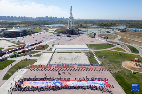 10月6日,人们在哈尔滨冰雪大世界园区参与绘画(无人机照片)。 10月6日,哈尔滨冰雪大世界园区举办千人共绘大美中国插画活动,500组亲子家庭在一幅长76米、宽..