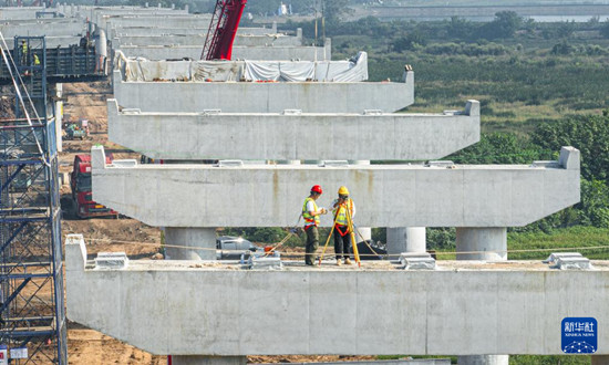 10月6日,在武汉都市圈环线高速公路孝感南段4标项目上,中铁二十局建设者进行施工作业(无人机照片)。 10月6日是中秋佳节,不少劳动者坚守岗位,保安全促生产,..