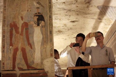 10月4日,游客在埃及卢克索帝王谷的阿蒙霍特普三世法老墓内拍照。 历经多年修复,古埃及法老阿蒙霍特普三世的陵墓4日首次正式向游客开放。该陵墓的历史可追..