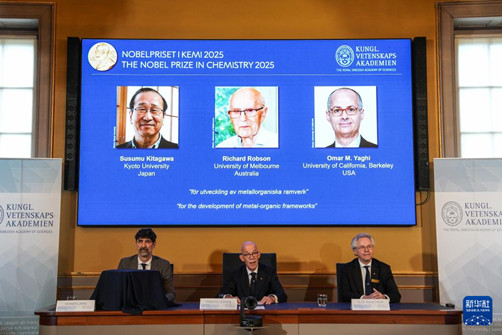 10月8日,在瑞典斯德哥尔摩举行的2025年诺贝尔化学奖公布现场,屏幕显示奖项得主头像和姓名。 瑞典皇家科学院8日宣布,将2025年诺贝尔化学奖授予北川进、理查..