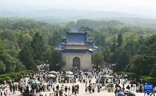 10月5日,人们在南京中山陵景区游览。 国庆中秋假期,神州大地车流如织,市场红红火火,景区人气正旺,各地假日经济活力十足。 新华社记者李贺摄..