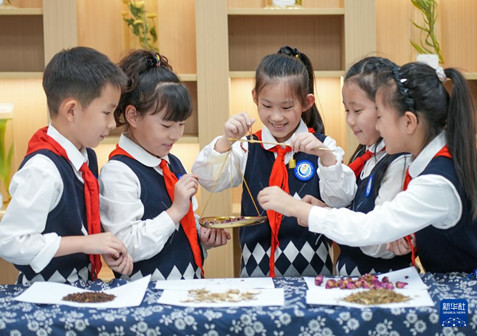 10月22日,在江苏省泰州市姜堰区实验小学教育集团北街北校区,学生体验称量中草药。 10月22日是世界传统医药日,各地组织开展中医药文化体验主题活动,让大家..