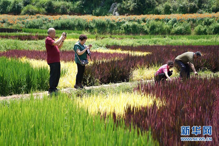 8月12日,游客在宜良县九乡麦地冲村观赏拍摄彩色稻田。 云南省昆明市宜良县着力打造创意农业、景观农业、实现“以农带旅、以旅兴农”的产业发展,其中种植的数百亩彩色稻田,在田间绘制了各类美丽画卷,吸引众多游客前来观光。